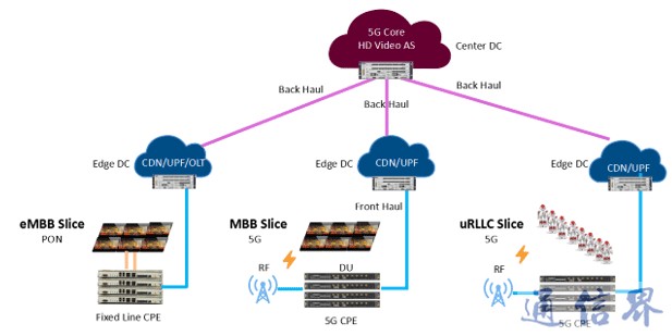 5G業務將呈現出多場景、差異化的特點,如移動上網業務聚焦帶寬,自動駕駛業務需要低延時和高可靠性保障,物聯網業務要支持巨大的連接數量。對此,5G的無線接入網和核心網都進行了功能重構,根據業務類型改變設備處理單元的物理部署位置,并通過切片在同一張物理網絡上對不同類型業務構建獨立的端到端邏輯網絡。