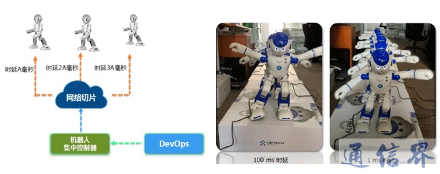 圖4為8個機器人模擬工業控制的場景,機器人是以串行方式控制的。 第一個機器人接收到命令后,開始跳舞,并通過網絡切片將此命令發送給第二個機器人,以此類推,因此最后的一個機器人的跳舞動作要比第一個機器人慢7倍的網絡切片時延時間。 如圖4左側所示。