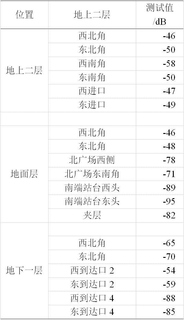 首先確定系統(tǒng)覆蓋范圍應涵蓋整個交通樞紐,根據合肥南高鐵站建筑設計圖,了解到地上二層空間較為空曠,無線電信號傳輸過程中遮擋物較少,信號衰減程度較;地面層空間較為空曠,信號傳輸問題不大;地下一層各個軌道間遮擋物如支柱樓梯馬道較多,信號衰減較為嚴重。架設一根天線于地上二層的中部偏北,用于二層及地面層偏北區(qū)域,又架設兩根天線于地面層和地下一層中部,信號的覆蓋可以滿足全站內的使用。實際電測數據如表1所示: