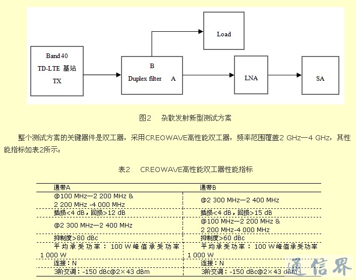 當前TD-LTE基站的射頻測試已然具有完善的標準測試體系和指標。雜散發射作為移動基站射頻性能的重要測試項之一,一般情況下,其輻射指標為-36 dBm。而當LTE基站與其他GSM、WCDMA等基站共址時,其輻射指標要求很高,為-96 dBm甚至更低。本文根據3GPP射頻一致性測試協議36.141(LTE; Evolved Universal Terrestrial Radio Access (E-UTRA); Base Station (BS) conformance testing)章節6.6.4,以TD-LTE Band40為例,提出一種由雙工濾波器和低噪放相結合的測試方法,并在此基礎上實現了一種新型的共址雜散發射測試方案。