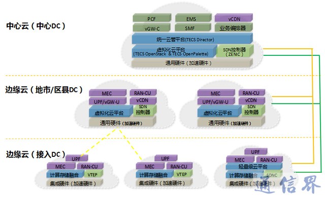 分布式云可以由中心云和邊緣云構成,其中邊緣云又可以細分為地市、區縣以及接入。中心云定位為大腦和中樞,主要承載控制/管理以及集中化的媒體面網元;邊緣云主要承載分布式部署的用戶面/媒體面網元以實現流量快速卸載,以及實時性要求較高的網元,優化用戶體驗,例如高清視頻、車聯網、VR/AR等業務。