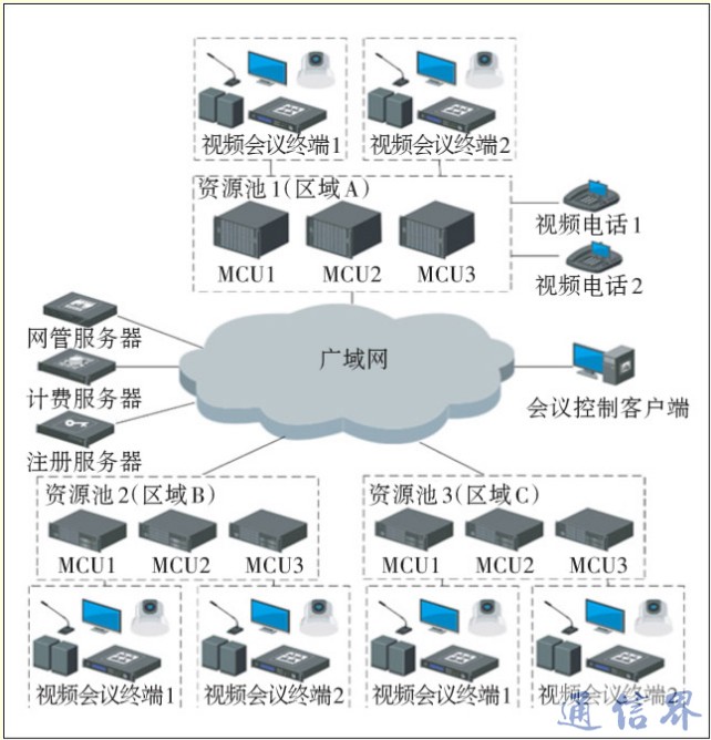 MCU資源池架構是把分散在各地的專用MCU設備、流媒體轉發服務器設備以及其他高性能服務器,通過資源抽象的方式虛擬成資源池,實現對全網資源統一的分配、管理、調度、監控。資源池對外統一提供會議端口資源,并可根據網絡條件有選擇地實現MCU間以服務器或板卡為單位的資源負載均衡和本地/異地容災備份,視頻業務的使用者只需要通過網絡就近注冊接入到所轄的資源池即可享受到服務。網絡拓撲結構如圖1所示,系統架構圖如圖2所示。