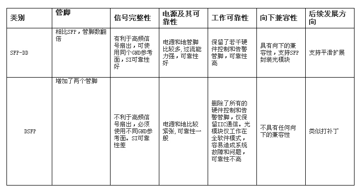 DSFP增加了兩個管腳不利于高頻信號扇出,必須使用不同GND參考面。SI可靠性差電源和地比較緊張,可靠性一般刪除了所有的硬件控制和告警管腳,僅保留IIC通信。光模塊僅工作在全軟件模式,容易造成系統故障和問題,可靠性不高不具有任何向下的兼容性類似打補丁。