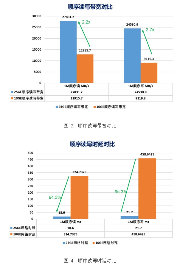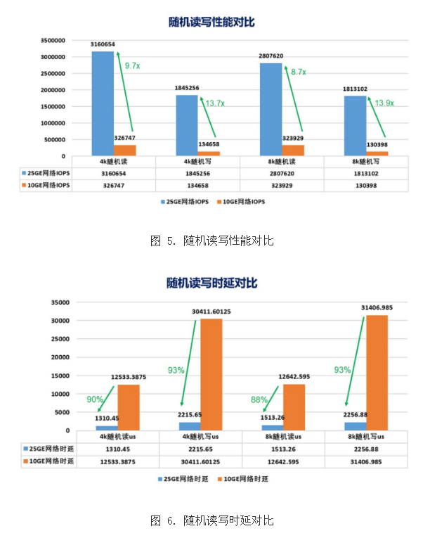 福建電信以 8 計算節(jié)點情形作性能測試,以衡量技術(shù)創(chuàng)新帶來的優(yōu)勢。在關(guān)鍵的 4K 隨機讀寫測試中,25GE RoCE 網(wǎng)絡的吞吐是 10GE 網(wǎng)絡的 9~14 倍左右,而延時相比 10GE 網(wǎng)絡僅為其 5~10%。明顯可見,25GE RoCE 網(wǎng)絡大大提升了分布式存儲的吞吐,也極好的降低了系統(tǒng)延時。在相同環(huán)境下,25GE 網(wǎng)絡順序讀寫的帶寬也是 10GE 網(wǎng)絡 2.2 倍以上,而延時則僅為 10GE 網(wǎng)絡的 5%左右。