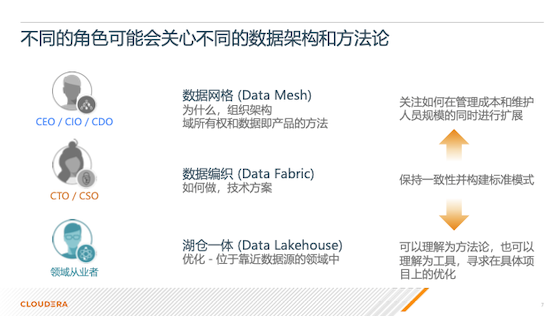 值得一提的是,這三種正在被外界廣泛討論并認可的方法論其實本身并不矛盾。劉隸放認為面對企業內部的不同角色,就需要講不同的數據架構和方法論。