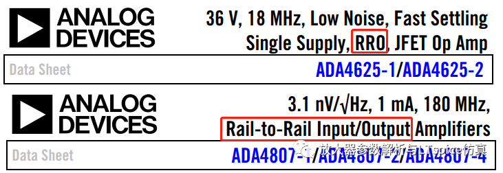 如圖2.173,部分放大器數據手冊的首頁標有軌到軌(Rail-to-Rail,RR)的描述。它是指放大器的輸入電壓范圍、輸出電壓的擺幅接近(不是等于!!!)電源電壓。具體類型包括軌到軌輸出(RRO)、軌到軌輸入與輸出(RR I/O)。