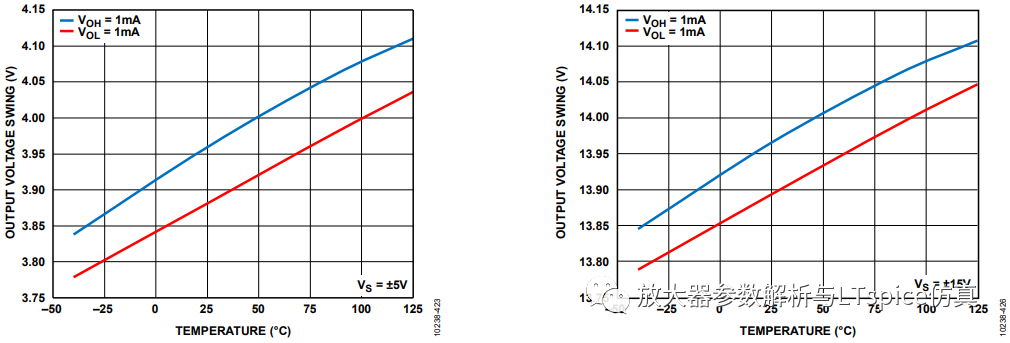 數據手冊中給出的方式有兩種,其一,直接提供高、低輸出電壓值。如圖2.3,ADA4077在±15V供電,驅動1mA負載時,低輸出電壓為-13.8V,高輸出電壓為+13.8V。