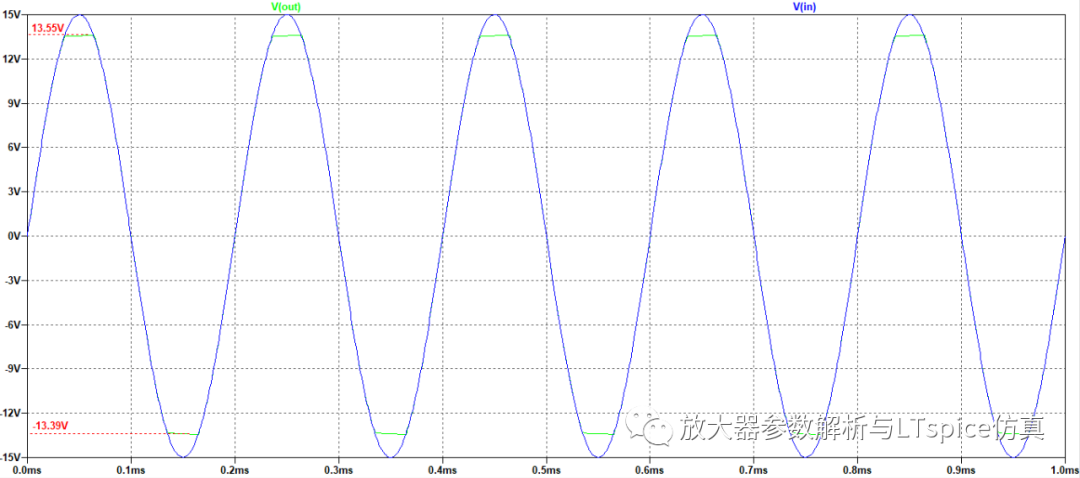 電路瞬態分析的如圖2.170,輸入信號V(in)是正弦波幅值為±15V頻率為5KHz,但是輸出信號V(out)的發生失真,在波峰處被削平,最高輸出電壓為13.55V,最低輸出電壓為-13.39V。