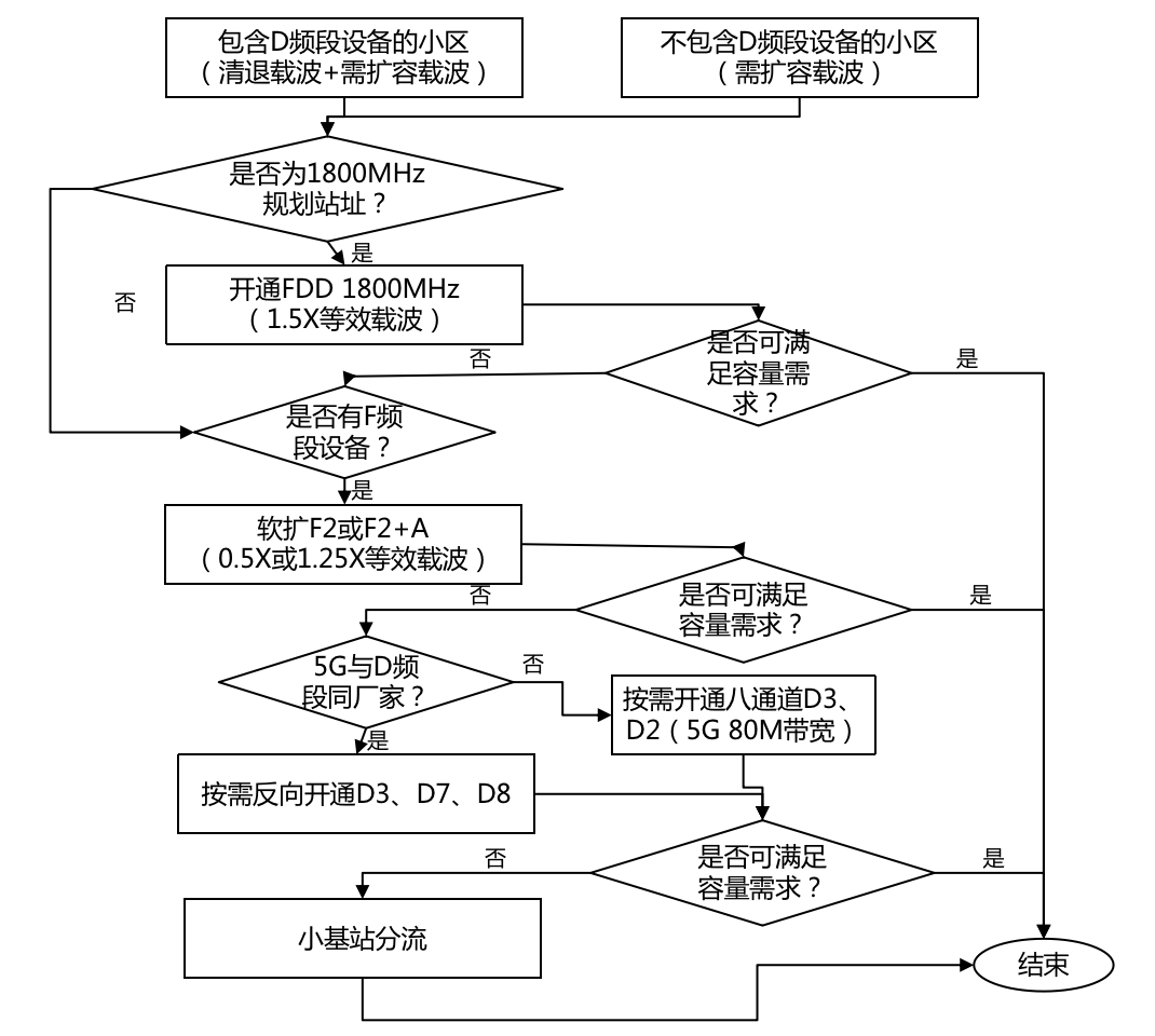 4G網絡經過多期建設,其站型組成非常復雜。以室外小區的所屬天面為統計粒度,覆蓋一片物理區域的4G物理扇區包含多個邏輯小區種類,如單D扇區(1D/2D/3D小區)、F/D扇區(1F1D/1F2D等)、單F扇區、D/F/FDD混合扇區等。另外,4G網絡擴容可用的頻段資源有6種:TD-L制式的F頻段、A頻段、D頻段,5G反向開通4G功能的D頻段,FDD制式1800MHz及900MHz頻段,考慮到工程實施時,還將涉及到新增硬件和軟件擴容等具體實現方式,可以選擇的擴容手段更多。這種已有站型結構和可選實施方式均存在物理上的構成復雜度,也必然帶來不同扇區擴容時,在選擇擴容制式和使用頻段方面的復雜性。