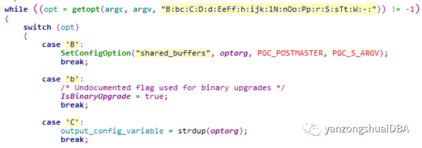 如果啟動(dòng)PG進(jìn)程時(shí),通過命令行參數(shù)指定了一些GUC的參數(shù)值,那需要從命令行中將這些參數(shù)值解析出來并設(shè)置到相應(yīng)GUC參數(shù)中。根據(jù)命令行配置主要調(diào)用函數(shù)getopt和SetConfigOption來配置,比如: