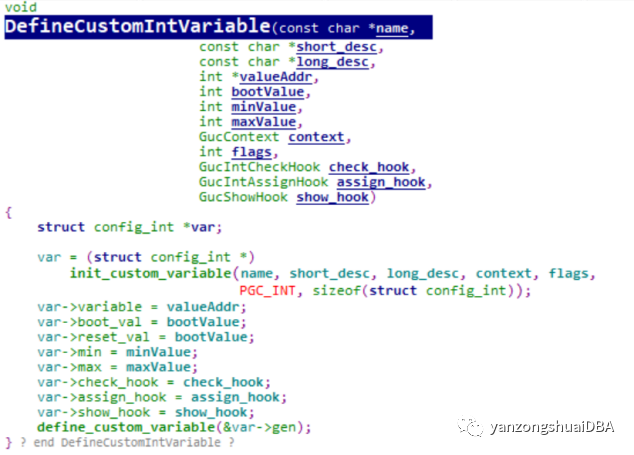 該插件在_PG_init函數(shù)中新增定義一個(gè)GUC變量。上圖所示,由函數(shù)DefineCustomIntVariable來完成,auth_delay新增的配置項(xiàng)是auth_delay.millisenconds,對(duì)應(yīng)到程序中是auth_delay_milliseconds變量。
