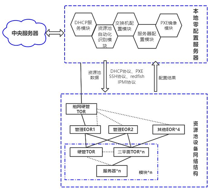 網絡云資源池硬件集成零接觸自配置的技術方案,就是針對集成過程中運營商自身需求和跨廠商集成痛點進行設計,在設備上架上電后,即可自動確認資源池信息、設備信息及配置內容,自動下發配置到待配設備。整個過程無需人工參與(零接觸)、全自動化持續進行(自配置),實現現場隨建隨配、“即插即用”的效果。