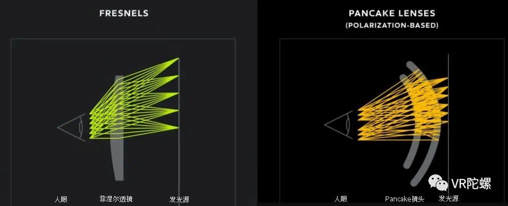 基于此類問題,憑借著 VR 產(chǎn)品體積可進一步縮小,近眼顯示光學(xué)功能性可進一步增強,以菲涅爾透鏡為主的光學(xué)方案正在全面被 Pancake 光學(xué)所取代。