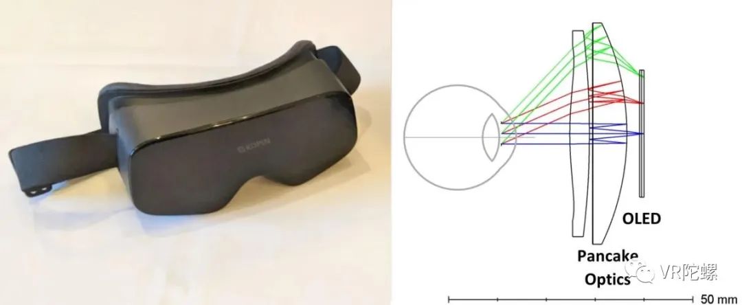 一項技術(shù)的應(yīng)用落地,需要產(chǎn)業(yè)鏈長期的驗證,Pancake 光學(xué)亦是如此。早在 2015 年,eMagin 就展示了一個極其緊湊的基于 Pancake 光學(xué)的 VR 頭顯原型設(shè)計,Kopin 在 2017 年也展示了類似的基于微顯示器的 Pancake 光學(xué)設(shè)計。