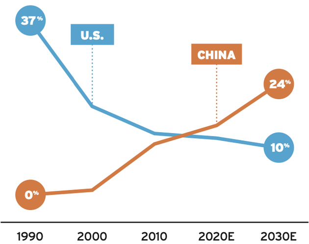 (圖注:過去30年美國芯片產能全球比重已經從37%下滑到了10%)