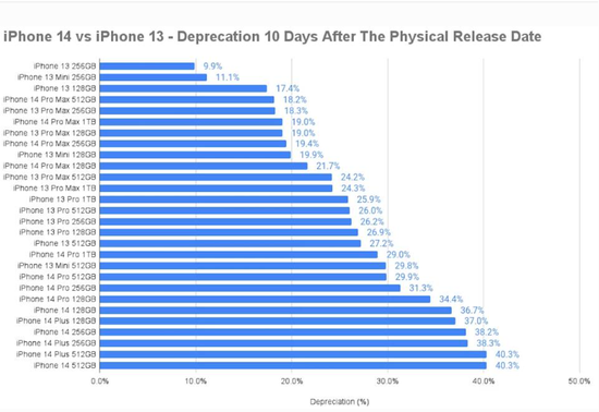 iPhone 14 VS iPhone 13發布后10天的貶值對比,圖片來源:SellCell
