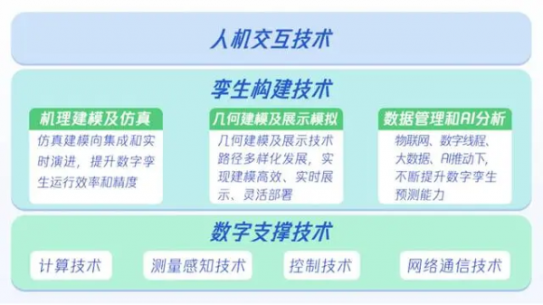 報(bào)告還指出,數(shù)字孿生技術(shù)體系涉及數(shù)字支撐、孿生構(gòu)建、人機(jī)交互三大類技術(shù),這些技術(shù)不斷進(jìn)行創(chuàng)新升級(jí),共同提升了數(shù)字孿生的實(shí)時(shí)性、精準(zhǔn)性、靈活性和交互性。其中,幾何建模及展示技術(shù)路徑呈現(xiàn)出多樣化趨勢(shì),推動(dòng)了數(shù)字孿生向建模高效、實(shí)時(shí)展示、部署靈活的方向發(fā)展;物聯(lián)網(wǎng)、數(shù)字線程、大數(shù)據(jù)為數(shù)字孿生提供了數(shù)據(jù)支撐能力,人工智能也促進(jìn)了數(shù)字孿生預(yù)測(cè)能力;仿真建模開始向集成和實(shí)時(shí)演進(jìn),助力數(shù)字孿生構(gòu)建精確模型;數(shù)字支撐技術(shù)進(jìn)行持續(xù)迭代,夯實(shí)了數(shù)字孿生的基礎(chǔ)能力;XR技術(shù)基于沉浸式交互能力,拓展了數(shù)字孿生的應(yīng)用空間。