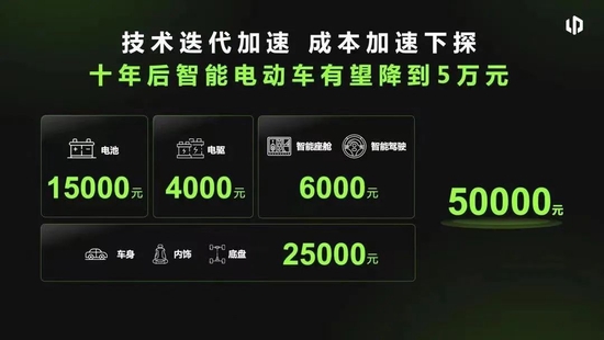 零跑科技創(chuàng)始人、董事長、CEO朱江明不僅認(rèn)同“軟件定義汽車”這一觀點(diǎn),更在中國電動汽車百人會論壇(2023)上表示,軟件定義汽車的時代,智能技術(shù)迭代應(yīng)該遵從“摩爾定律”,用的人越多,智能軟件迭代越快,價格越便宜。并給出了十年后智能電動車將進(jìn)入5萬元時代的觀點(diǎn)。