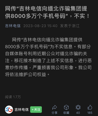 吉林電信:網傳向緬北詐騙集團提供8000多萬個手機號碼信息不實