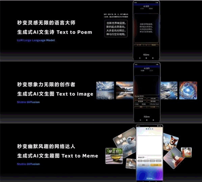 天璣 9300 還支持多模態生成式 AI 大模型,打造出“文生詩”“文生圖”“文生趣圖”等豐富有趣的端側體驗。