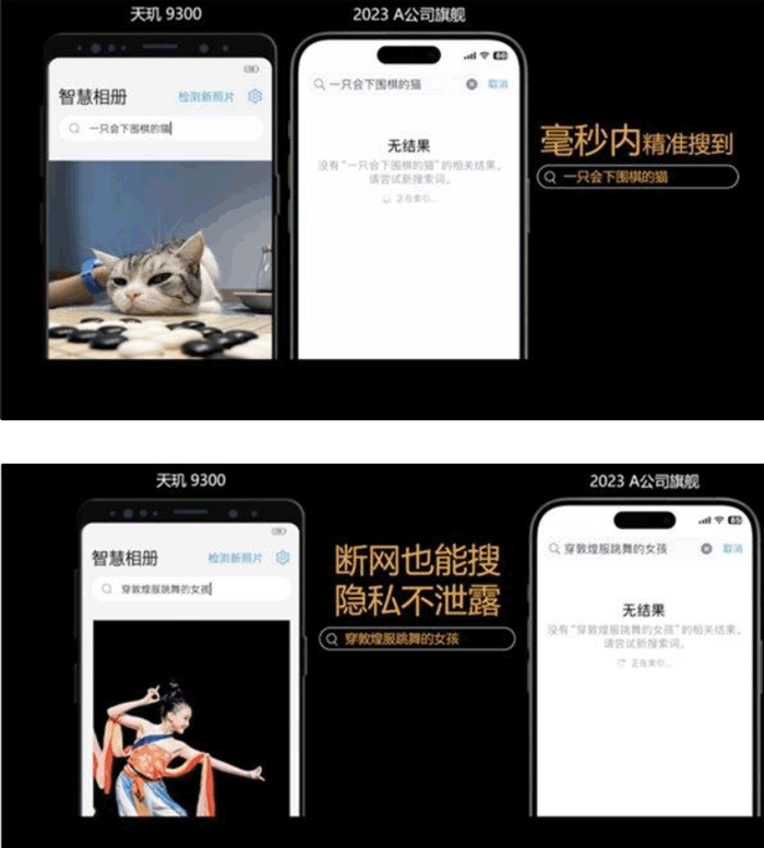 極感科技的生成式 AI 語意搜索技術也基于天璣 9300 APU 邊緣計算能力,對比前代,性能可提升 260%。比如在手機的相冊中搜索照片,描述照片的內容即可在毫秒內精準搜到對應的照片。而且在斷網狀態下也能搜索,隱私也不會泄露。
