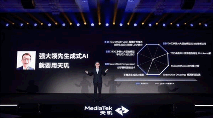 基于以上,天璣 9300 首次在 vivo 旗艦手機端側落地 70 億參數 AI 大語言模型,處理速度可達 20 Tokens 每秒。不僅如此,聯發科突破了行業極限,已經與 vivo 成功在端側運行了 130 億參數的大語言模型。甚至,天璣 9300 已率先實現在移動芯片上成功運行 330 億參數的 AI 大語言模型,領跑業界。