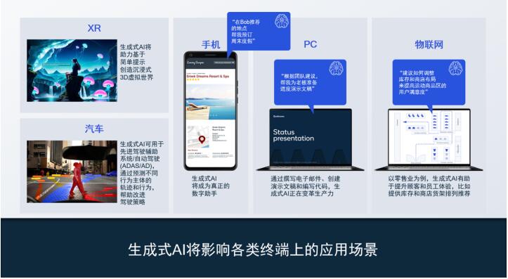 生成式AI的迅速興起,正驅(qū)動新一輪內(nèi)容生成、搜索和生產(chǎn)力相關(guān)用例的發(fā)展,覆蓋包括智能手機、筆記本電腦和PC、汽車、XR以及物聯(lián)網(wǎng)等終端品類。而混合AI架構(gòu)將賦能生成式AI在上述這些終端領(lǐng)域提供全新的增強用戶體驗。比如,借助生成式AI,智能手機能夠成為真正的數(shù)字助手,讓用戶自然地溝通交流,并獲得貼切的回答。PC用戶可以利用這項技術(shù)閱讀或撰寫電子郵件、起草文檔和自動創(chuàng)建演示文稿。在駕乘汽車時,對話式車內(nèi)助手可以給駕乘者提供豐富的服務(wù)。