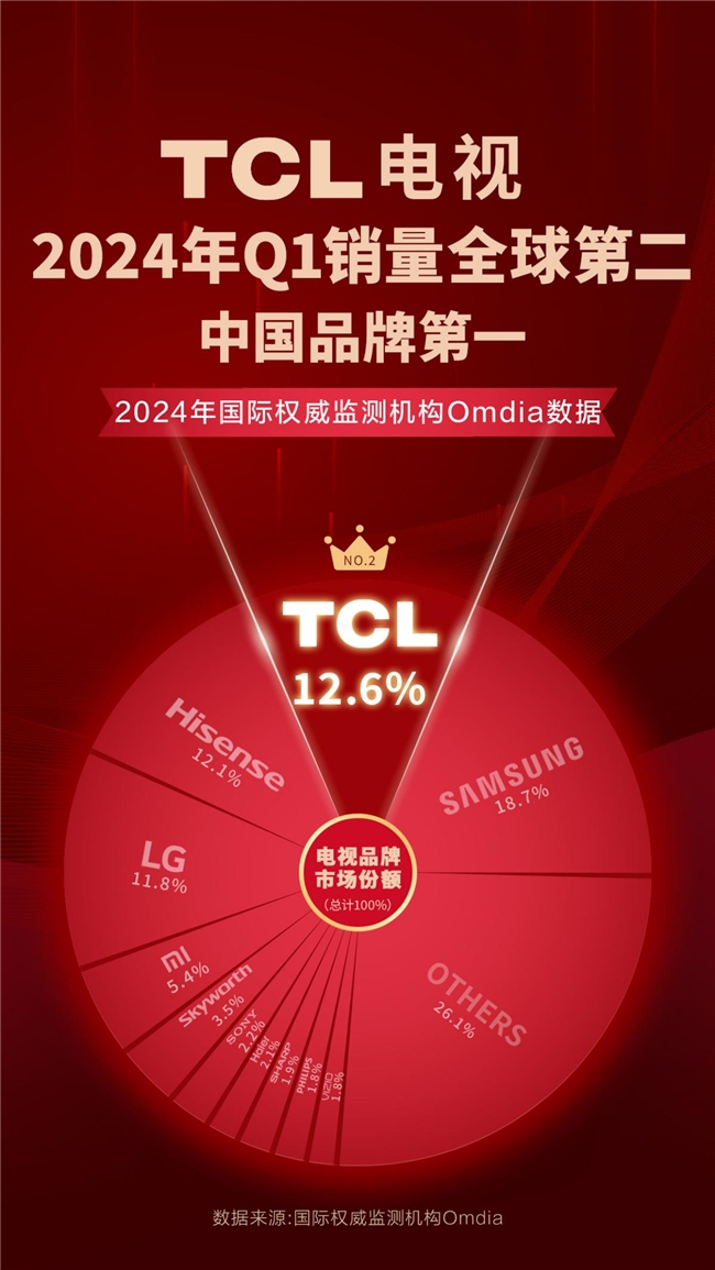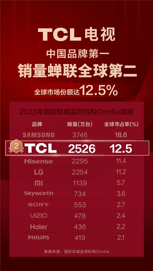 2023年,TCL品牌電視保持全球領(lǐng)先地位,根據(jù)國際權(quán)威監(jiān)測機構(gòu)Omdia數(shù)據(jù)顯示,TCL電視銷量市占率達12.5%,位居全球第二。其中,TCL 98吋電視全球銷量排名第一。在北美市場,TCL電視出貨量同比提升15.8%,零售量在美國排名第二;在拉美區(qū)域,TCL電視銷量市場份額在巴西排名第三。此外,TCL空調(diào)出貨量也位列全球前四。