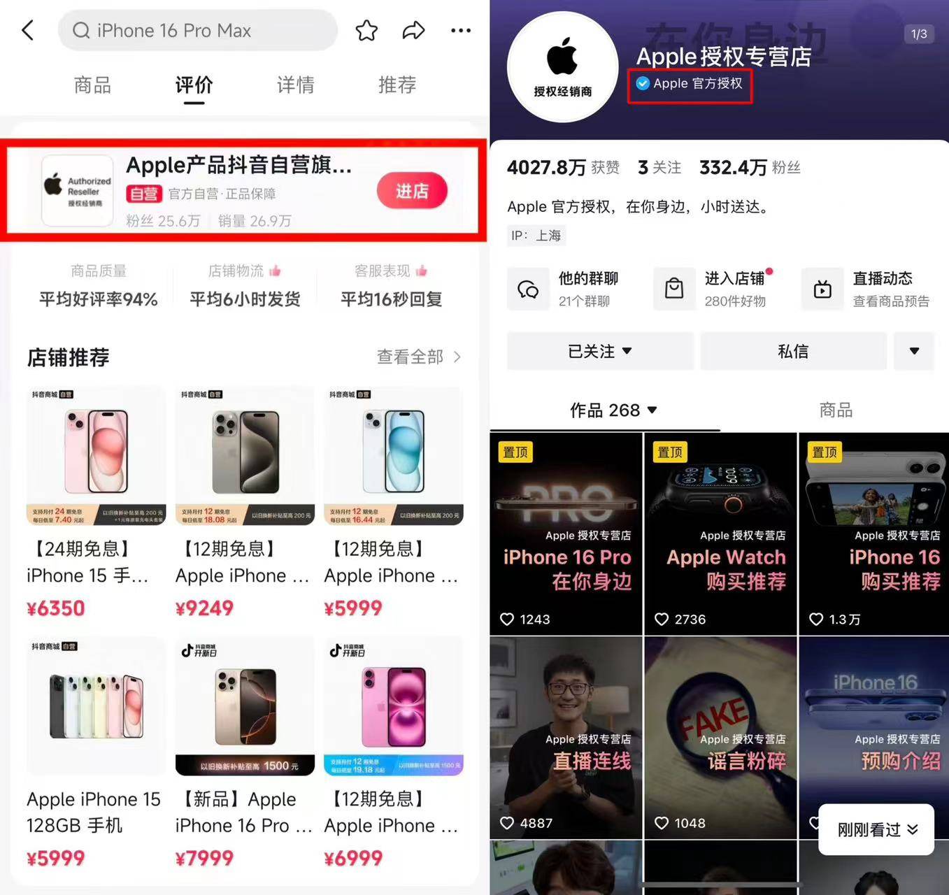 2022年,蘋果就正式進駐抖音,將旗下經典的“Shot on iPhone”營銷動作與市場內體量較大的短視頻平臺縫合。2023年,Apple產品抖音自營旗艦店正式上線。現在,抖音上的蘋果授權經銷商絕大部分已開設直播間,今年, Apple 授權專營店還與影視颶風在抖音連麥。