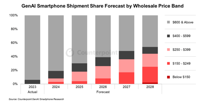 根據(jù)Counterpoint的市場數(shù)據(jù)分析,生成式AI智能手機的市場正向高價位區(qū)間快速遷移。2023年至2028年,售價在600美元及以上的設(shè)備市場份額將顯著增長,而低于150美元的低端設(shè)備占比持續(xù)萎縮。