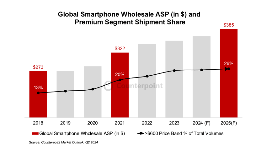 同時,全球智能手機平均售價正在持續(xù)上漲。2024年同比增長3%,達(dá)到365美元,2025年更將進(jìn)一步增長5%。這一系列數(shù)據(jù)清晰表明,智能手機市場的高端化趨勢不僅是消費升級的體現(xiàn),更是生成式AI推動行業(yè)變革的重要。