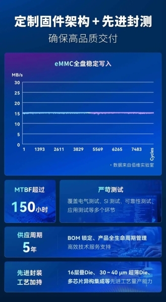 在可靠性方面,佰維存儲芯片采用了多層疊Die、超薄Die、多芯片異構集成等先進封裝技術,兼顧保障產品性能、可靠性及散熱等。同時,公司存儲芯片遵循嚴苛測試流程,覆蓋電氣測試、SI測試、可靠性測試、應用測試等多個環節,能夠承受高達1500G重力加速度、20-2000Hz振動幅度,MTBF超過150萬小時,全方位保障產品的高品質交付與一致性。
