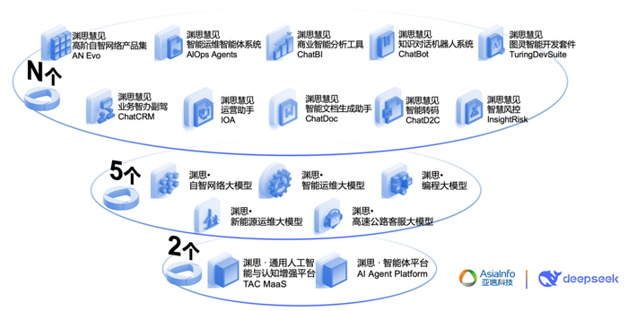 2024 年上半年,亞信科技發布了 “淵思” 行業大模型產品系列,面向千行百業,聚焦“平臺、模型、工具”三個層面建立的通用人工智能與行業認知增強一體化的行業大模型產品體系。該產品體系包括2個平臺,即通用人工智能與認知增強平臺(Technology Augmented Cognition MaaS,簡稱TAC MaaS)和智能體平臺(AI Agent Platform,簡稱AAP)+ 5個行業專屬大模型 + N個適配特定應用場景的認知增強工具,覆蓋從大模型研發到應用落地生命周期全流程,助力企業高效完成一站式智能轉型,已在通信、政務、能源等20多個重點行業實現規模落地,為行業數智化轉型打造AI原生應用。