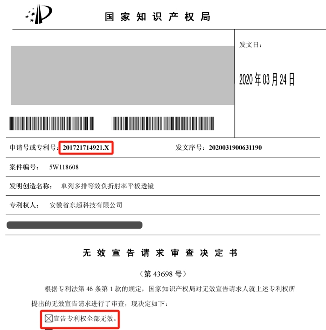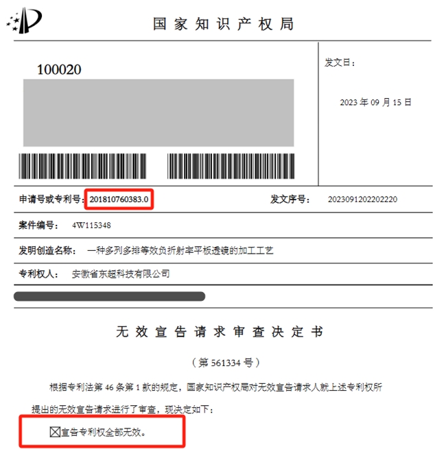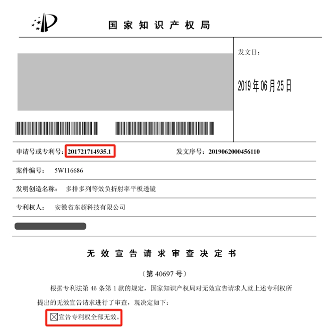 近日,國家知識產(chǎn)權(quán)局最新公告顯示,安徽省東超科技有限公司(以下簡稱“東超科技”)持有的"一種多列多排等效負折射率平板透鏡的加工工藝"(專利號CN201810760383.0)發(fā)明專利已顯示無效。