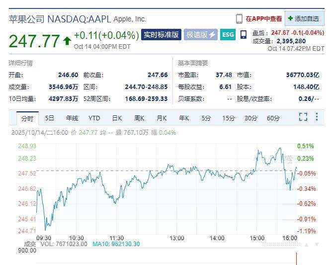 截至當地時間10月14日收盤,蘋果報247.77美元,漲幅0.04%,最新市值約3.7萬億美元。