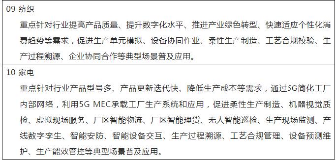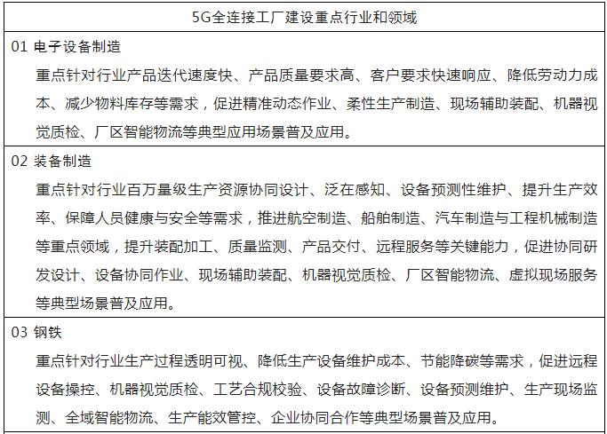 “十四五”時期,主要面向原材料、裝備、消費品、電子等制造業各行業以及采礦、港口、電力等重點行業領域,推動萬家企業開展5G全連接工廠建設,建成1000個分類分級、特色鮮明的工廠,打造100個標桿工廠,推動5G融合應用縱深發展。