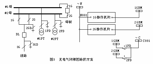 ②沒(méi)有電氣五防回路的解決方案(如圖3所示),只將母線接地刀閘的輔助接點(diǎn)串接在母線刀閘的控制回路中即可(此方案需增加電纜),其它閉鎖(如倒母線條件)靠微機(jī)五防閉鎖。以上二方案簡(jiǎn)單、可靠,沒(méi)有增加正常運(yùn)行操作和事故處理的復(fù)雜性[3]。
