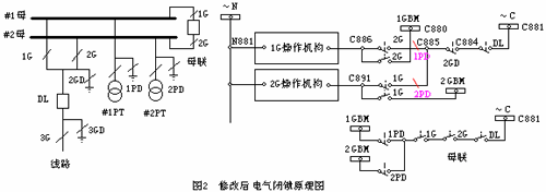 ①有電氣閉鎖的解決方案如圖2所示,在原有電氣閉鎖保留完整的情況下,可增加2GBM小母線(一般情況下GBM的電纜都會(huì)有備用芯,不會(huì)增加電纜的敷設(shè)工作量,二次接線在端子排上將原有的1G和2G之間的連線拆開(kāi)即可)。
