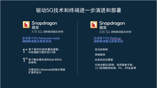 驍龍X75是全球首個(gè)5G Advanced-ready調(diào)制解調(diào)器及射頻系統(tǒng),同時(shí)引入第二代高通5G AI套件,在網(wǎng)絡(luò)覆蓋、時(shí)延、能效和移動(dòng)性等維度進(jìn)一步突破;不久前,驍龍X75還實(shí)現(xiàn)高達(dá)7.5Gbps的下行傳輸速度,創(chuàng)造了Sub-6GHz頻段全球最快的5G傳輸速度紀(jì)錄,進(jìn)一步突破5G性能邊界。驍龍X35則是全球首個(gè)5G RedCap調(diào)制解調(diào)器及射頻系統(tǒng),擁有卓越能效,支持出色的定位精度,助力5G擴(kuò)展至智能手表、入門(mén)級(jí)物聯(lián)網(wǎng)終端等豐富用例。