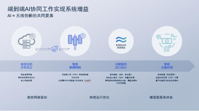 AI對(duì)整個(gè)無(wú)線通信系統(tǒng)的增益十分明顯,AI能夠分布在從云到端的多個(gè)環(huán)節(jié),支持高效網(wǎng)絡(luò)規(guī)劃、持續(xù)進(jìn)行優(yōu)化、增強(qiáng)服務(wù)體驗(yàn);并通過(guò)端到端AI協(xié)同,提升整個(gè)無(wú)線通信系統(tǒng)的性能表現(xiàn)。例如,在AI的加持下,終端能夠更全面地把握無(wú)線信道的特征和變化趨勢(shì),使信道狀態(tài)預(yù)測(cè)和反饋更精準(zhǔn),助力提升吞吐量和其它關(guān)鍵性能指標(biāo)。